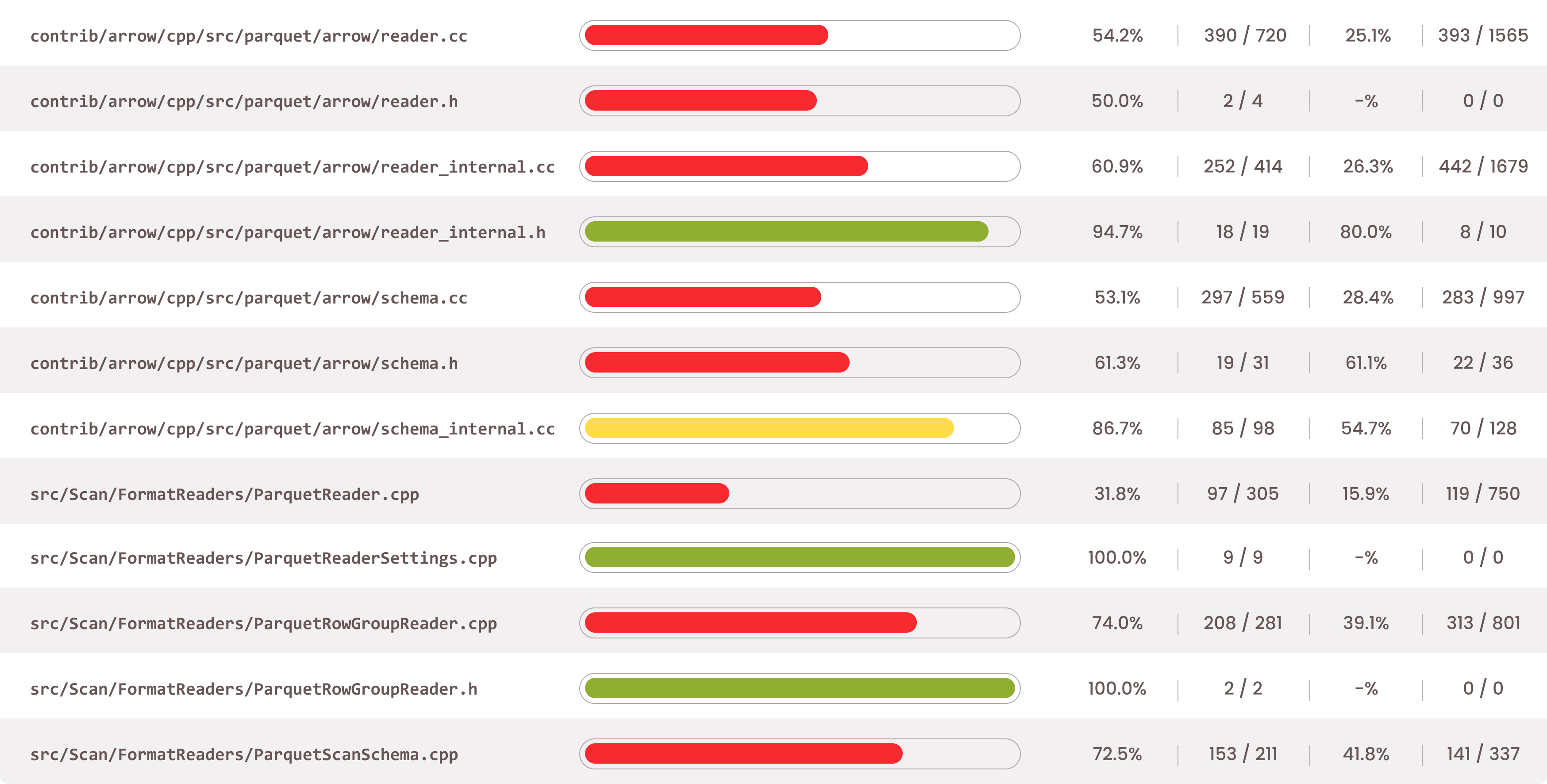Fuzzing our Parquet interfaces (READ_PARQUET and COPY FROM) for about an hour yields >60% median BB coverage, and ~40% of branch coverage in some of the most critical reader code-paths.
