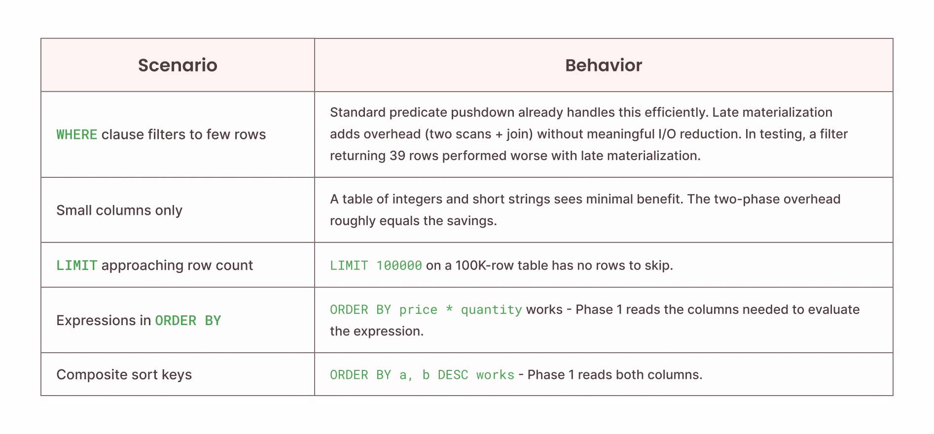 2. The LIMIT is much smaller than the rows processed. If you're selecting 10 rows from 100 million, 99.99999% of column data is skipped. If your WHERE clause already filters to 50 rows before the ORDER BY, late materialization adds overhead without benefit.
