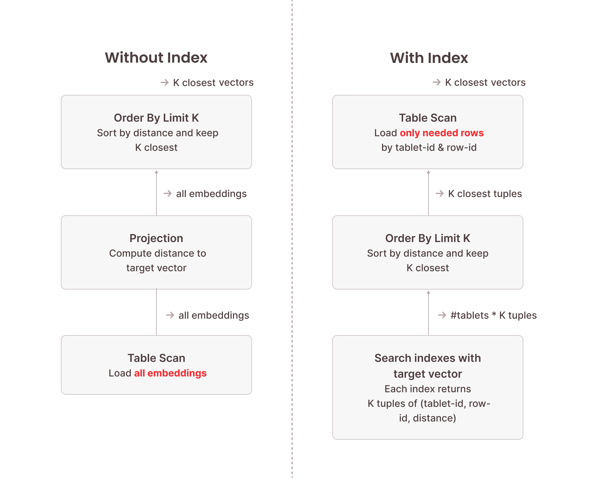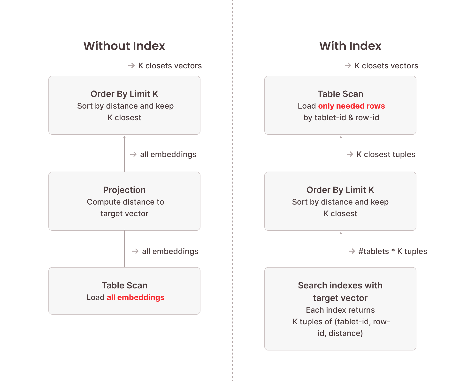 The following image illustrates the difference between vector search using a vector search index and brute-force vector search without an index. Because the index structure is optimized for this specific task and doesn’t need to inspect each vector stored in the index, searching the vector search indexes is orders of magnitude faster than a full table scan. The table scan performed afterwards only needs to load a fraction of the data stored in the table because we know their precise location from the vector index.
