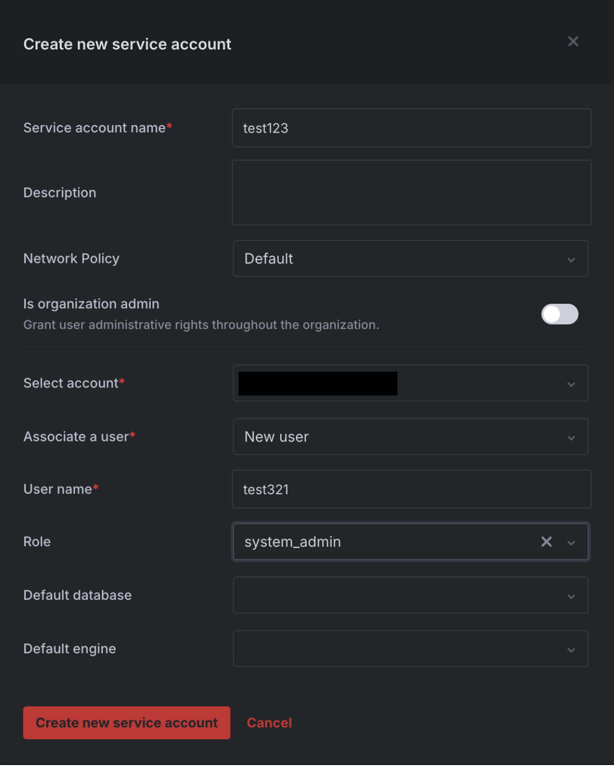 ^ Note : You can create service account by following the service account creation guide. When creating the associated user, ensure you select system_admin from the default system roles for proper access permissions. If you require assistance in getting access to these credentials in firebolt contact your organization_admin user.