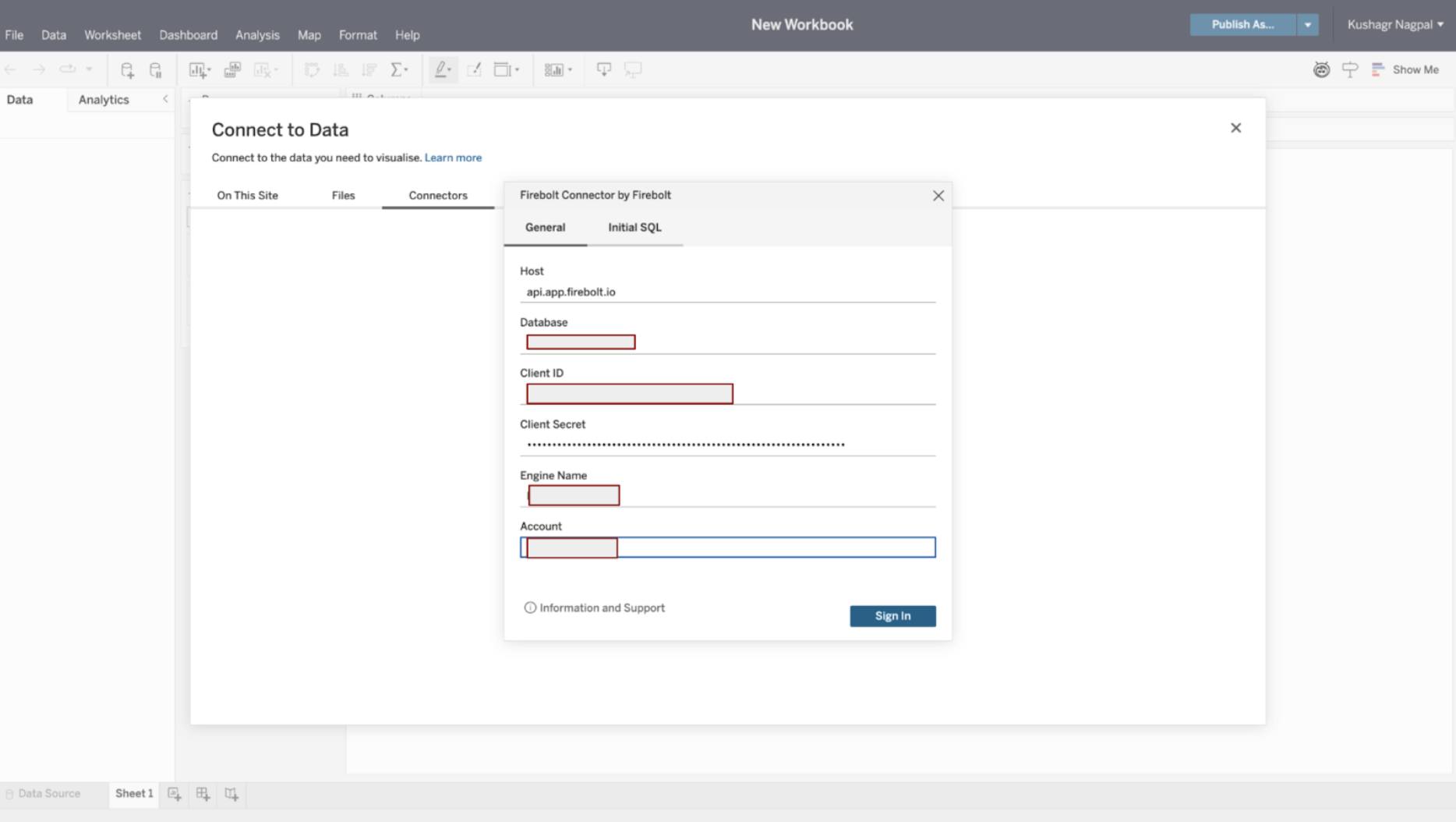 Enter your Firebolt connection details to establish the link between Tableau and your analytical database.