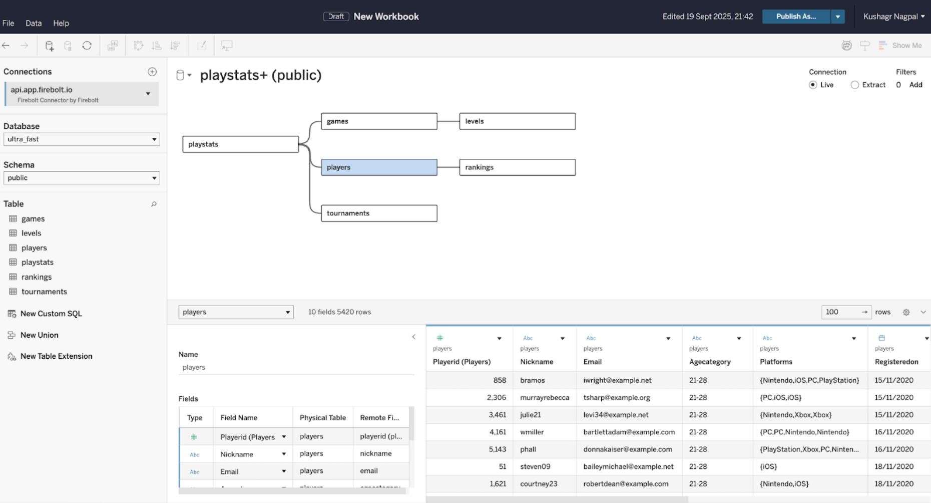 Once connected, Follow these steps to access your Firebolt tables in Tableau: